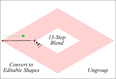 (Right) Select the Blend and from the Arrange menu, select Convert to Editable (not edible) Shapes. Then from the Arrange menu, select Ungroup. (In CorelDRAW, this process is the same as Separate and Ungroup).