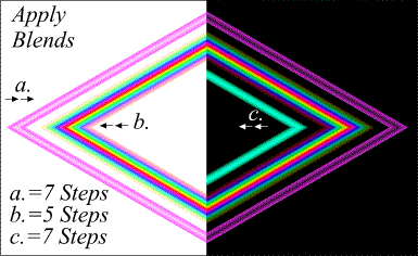 a. Xoom in on the corner of the diamond shapes. Drag the Blend Tool from the outer most pink diamond shape to the center pink diamond shape. Change the number of Blend Steps to 7. Drag the Blend Tool from the center pink shape to the inner most pink diamond shape as shown. Leave the Blend Effect at Fade (the default).