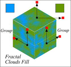 Here's a little secret just between us girls, if you group several objects, apply a fill to the group, Xara treats the group as one object. Better still, when you Ungroup the objects, the fill remains unchanged. (You cannot do this in CorelDRAW). Armed with this secret, group the two panels that make up the left side of the cube, then group the right two panels that make up the right side. Select the top of the cube, then select the Fill Tool and pick Fractal Clouds from the Fill Type drop-down list. The blue color is RGB 0, 153, 255. The green color is RGB 102, 153, 0. Click on the fill with the right mouse button. Change the Fractal Graininess setting on the Infobar to 3 (if it is not already set to 3).