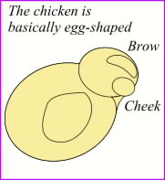 A baby chick is shaped just like an egg. Coincidence? You decide. Begin with some soft round shapes. Add a triangular section between the head and body. Add a brow by using the Shape Tool on an ellipse Converted To Editable Shapes. Add a puffy cheek.