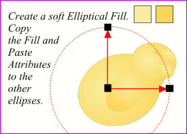 Baby chicks are very soft. No sharp edges. Create an Elliptical Fill using pale gold and very pale yellow. Copy the fill and Paste Attributes to the other shapes. Move the centers of the fills to make the distinction between them more subtle.