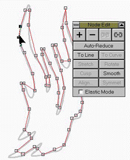 Before you start, click on the Freehand Tool fly out menu and select the Bezier Line Tool, (the second choice). With it you can draw a continuous path with a series of single clicks. Draw a rough outline clicking at the approximate begin and end points to each curve. When you’ve finished, marquee select (drag a box around) your drawing with the Shape Tool and double click on one of the nodes to open the Node Edit dialog box. Click on the To Curves option. Drag the rubber band-like line segments (not the nodes) with the Shape Tool to conform to the bitmap template. This technique is very effective for creating smooth outlines.