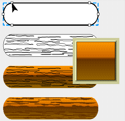 Fire needs something to consume so we’ll create a log to burn. Draw a rectangle. Use the Shape Tool to round the corners by dragging one of the corner nodes. Give the log a fountain fill, like the one shown here, using oranges and orange-browns to reflect the warm glow of the fire. Draw a few irregular shapes, fill them with dark brown, no line, and duplicate them and spread them around the log to create the look of bark.