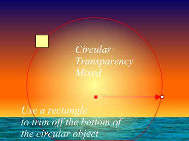 Draw a large circle (approx 2 2/4" diameter) and apply a pale yellow fill (RGB 255, 255, 204). Draw a rectangle over the portion of the circle that extends beyond the ocean, and select the rectangle and the circle and from the Arrange menu, select Combine Shapes--Subtract Shapes, to trim off the bottom portion. Use the Transparency Tool to apply a Flat, Mix, Circular Transparency . This creates a subtle flare over which we'll place our poetic golden sun. .