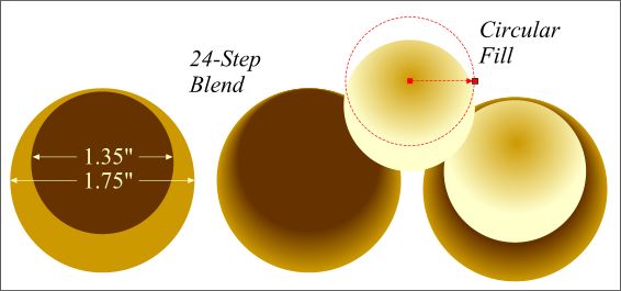 Select the duplicate of the small circle and using the Fill Tool, apply a two-color Circular Fill using these RGB colors, 204, 153, 0 (the darker center color) and 255, 255, 204 (the pale yellow outer color). Position this circle directly over the darker circle in the blend. Instant (well almost instant) multi-color circular fill.