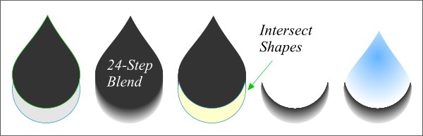 Did I tell you to make two additional duplicates of the drop shape? Rats! I was afraid of that. Well anyway, you'll need two more drop shapes. Position them just as you did for the Subtract Shapes operation. Fill the top shape 80% Black and the bottom shape 10% Black. Apply a 24-step Blend. Position the crescent shape (that we created on the last page) so it is centered horizontally and aligned with the bottom as shown here. Select the blend and the crescent and from the Arrange menu select Combine Shapes -- Intersect Shapes. This should eliminate everything except the crescent shape which will now contain the bottom portion of the blend. (This is like CorelDRAW's PowerClip effect.) Select the drop shape with the sky blue and white Circular Fill and position the crescent shape centered and bottom aligned. Group (Ctrl-G) the two elements. This is our silver raindrop.
