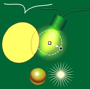 Rotate the light as shown. Create and rotate a yellow ellipse and apply a Circular Interactive Transparency (shown here in the dotted line and directional arrow). Click on the inside square and change the number on the new Property Bar to 0% (no transparency). Click on the outside square and change the percentage to 100 (complete transparency). This adds a realistic diffused glow to the light.