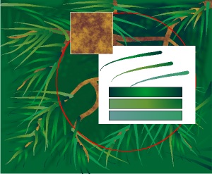 Place the branches over the background and apply a Texture Fill-Styles, Mineral Speckled, 2-colors (shown in the square) to add a bark like texture. With the Teardrop Media Pen draw a whole bunch more needles. Create some different multicolor linear fountain fills like the three shown here, and apply the fills to different needles.