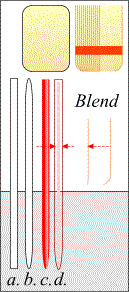 Every snowperson needs a broom. Draw a rectangle for the bristles. Use the Rounded corner option. Convert the rectangle to Editable Shapes, and flatten the top as shown on the right. Make a duplicate, use the Shape Tool to Break at Points leaving just a J-shaped curve (shown under the word Blend). Make a duplicate, squash it width-wise, and position it in the center of the modified rectangle shape. Give both cures a dark gold color and apply a 12-Step Blend. Flop and duplicate the blend for the other half of the bristles. Draw a tall, slim rectangle for the broom handle (a.). Use the Rounded Corners option (b.). Use the Shape Tool to square off the top (c.). Make a duplicate, fill pink, squash the shape width-wise. Apply a Linear Transparency (d.).