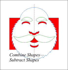 Select the crescent-shaped eyes, nose shadow, mouth opening and lower lip shadow and from the Arrange menu select Join. Select the Joined elements and then the head and beard shape and Combine Shapes -- Subtract Shapes. I filled the face white and placed the red rectangle behind the face to demonstrate the subtracted shapes portion.