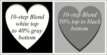 Next we’ll create a blend for the top edge of the heart, and a blend for the bottom edge. Select the three hearts and make a duplicate. First, create a 10-Step Blend using the top and center hearts. Fill the top heart white, the bottom heart 40% gray. Select both and Blend. Make a copy of the heart, we’re not through with it yet. Create a second Blend with the second set of hearts, make the top heart 50% gray, the bottom heart black. Note: When you create a Blend, click on one of the outside nodes first with the Blend Tool, and then drag a line to the same node on the inside shape. For example, with the blend on the left, click on the gray heart first, and then the white heart.