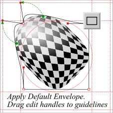 Disable Snap To Grid and enable Snap To Guidelines. Select the checkerboard shape, click the Mould Tool, and apply a Default Envelope (the rectangle icon on the left on the Property Bar). With the Mould Tool still selected, click in the upper left corner of the Default Envelope. Drag the small red control handles to the guidelines as shown. Whoa, that's a really weird shape! Trust me, I know what I'm doing! This will work. I hope.