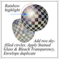 As you'll see in the final image, I went a little overboard creating a smaller checkerboard sphere that reflects in the larger sphere. Make a Duplicate (Ctrl-D) of the sphere, then make another Duplicate of the smaller sphere and Ungroup (Ctrl-U) the three elements (the checkered sphere and the two transparent overlays). Apply a Stained Glass Transparency, 70% to the checkerboard sphere. Select each of the top two transparent overlays (Stained Glass and Bleach) and Apply the Sky fill from the Fill Gallery. You will now have three transparent levels. Group them and apply a Default Envelope as shown. The idea is to narrow and curve the reflection.