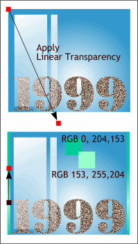 Select the white rectangular highlights and bring them to the front (Ctrl-F). With the white rectangles selected, select the Transparency Tool (the wine glass icon) and apply a Linear Transparency, type Mix, dragging the fill arrow as shown beyond the bottom of the rectangles. Add two slim rectangles, the same height as the blue background, to either side of the large blue rectangle. With the Fill Tool, apply a Circular Fill to each of the slender rectangles using the RGB colors shown and adjusting the center of the fill and the fill path arrows as shown on the bottom illustration. These slim rectangles will be the side of the glass.