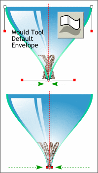 And now for a little magic. Drag a guideline through the center of the elements, then drag two guidelines about 1/8" from the center on either side as shown. Select all the elements, then select the Mould Tool (shown in the inset) and select the Default Envelope (the first rectangle on the Infobar). Four control nodes will appear on each corner of the envelope. Drag the bottom left node towards the center to the left guideline. Drag the right node to the right guideline. Holding down the Ctrl key will constrain the movement horizontally.