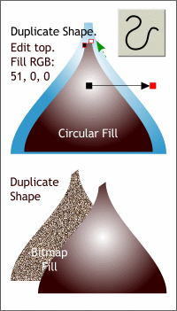 Make a duplicate of the bottom blue shape and resize it as shown in the top illustration. Using the Shape Editor Tool (shown in the inset) angle the top of the shape a little bit as shown. (Select the shape first, then the Shape Editor Tool, and drag the control node). Change the fill color to deep red using the RGB percentages shown. Change the fill type to Circular and drag the center of the fill upwards as shown.