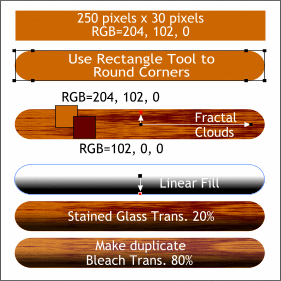 Select the rectangle, then the Fill Tool, and select Fractal Clouds from the Fill Type drop-down list on the Infobar. Click on the center node of the fill arrows, then click the small color wheel icon to the left of the screen palette and change the center color to RGB: 102, 0, 0. Drag the fill arrows as shown to give the appearance of wood grain.