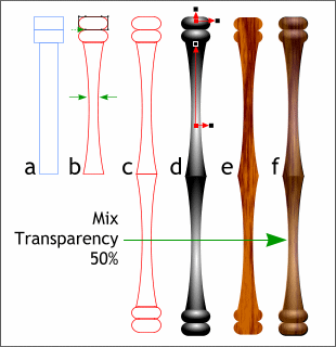 (f.) Place the wood grain-filled shape over the black and white fountain-filled shapes and apply a Flat, Mix Transparency, amount 50%. Group all the elements.