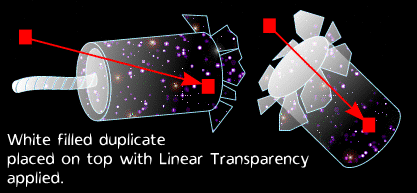 I want the firecracker to look like one of those constellation images you see in astronomy books where they hi lite three stars and then show a complete outline of Neptune! I also want to imitate the glassy look of these illustrations. First group all of the elements for the front section and then the back section of the firecracker. Add a solid white fill and then apply a Linear Transparency stretching the fill indicator arrows as shown here. This gives the firecracker a glassy look.