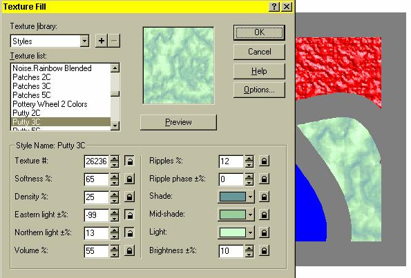 Colored glass comes in a variety of colors and degrees of opacity. I’ve altered Corel's Putty 3C Texture Fill to create a colored glass effect. Experiment with different colors and the Softness, Density and Volume settings to produce a range of colored glass. Name and Save your fills so you can use them again. Try different Textures too.