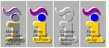 To create the embossed logo effect well create two duplicates of the stunning i/us logo. Well position one duplicate up and left and apply a white fill. The second duplicate well position down and right and fill 70% gray. Bring the original logo to the top and place a Copy in the Clipboard (Ctrl C). The logo and the white duplicate are selected and from Arrange, Combine Shapes-Subtract Shapes. Paste a Copy using Shift Ctrl V to place it directly on top. Repeat the process with the Copy and the dark gray duplicate. This creates a separate highlight and shadow edge. Paste a Copy on top.