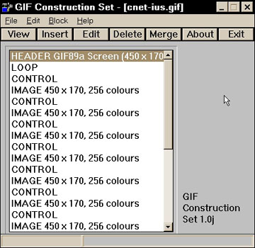 The animation we just created can be added directly to your HTML document simply by specifying the Gif file as an image (img src="filename.gif" enclosed in <> brackets). For addition editing, I like to open the file in Gif Construction Set (www.mindworkshop.com). Each frame can be edited separately including setting Transparency, Delay, and Remove by method.