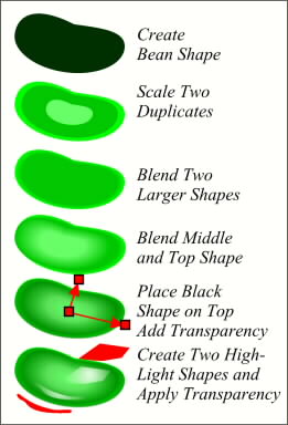 Create a jellybean shape by drawing a rectangle, rounding the corners, Convert To Editable Shapes (Arrange) then use the Shape Editor Tool to shape the sides. Make two smaller duplicates. Fill as shown. Copy the top two duplicates to the Clipboard. Blend the bottom two ellipses. Paste the top two from the Clipboard (Shift Ctrl V) and Blend them. Place a copy of the original bean shape on top. Fill black and apply an Elliptical, Stained Glass 50% Transparency. Create two highlight shapes, fill with a very pale green, and apply Circular Transparency. Slick!