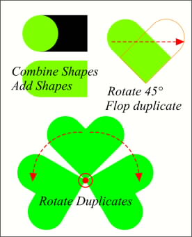 A field of clover begins with one clover leaf at a time. Weld a circle and a rectangle. (Arrange-Combine Shapes-Add Shapes). Rotate 45°, flop a duplicate and weld these two. Make and rotate two more duplicates (three if you want a field of four leaf clovers).
