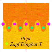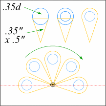 Use the Quick Shapes Tool to make a three-sided polygon (a triangle). Change the height to .5" and the width to .35". Draw a circle that is .35" in diameter and align it with the triangle as shown in the illustration on the right. Select the circle and make a smaller duplicate. Select the triangle and the larger circle and Combine Shapes--Add Shapes. Group the new shape and the smaller circle. Click twice on the group to toggle Rotate-Skew mode and drag the rotation bullseye to the very tip of the ice cream cone shape as shown. Hold down the Ctrl key and rotate the group to the right 45 degrees and then before you release the left mouse button, click the right mouse button to drop a duplicate. Repeat the process until you have a fan shape as shown.