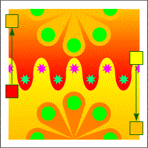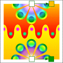 Select the top fan shape. Ungroup the elements. Select just the ice cream cone shapes and Combine Shapes--Add Shapes. Apply a Circular Fill with the center White and the outside Orange Yellow. Select Alt Rainbow from the Fill Effects drop-down list. Drag the center of the fill to the top center. Repeat this process with the bottom fan shape but this time use White and Green (Red=0 Green=102 Blue=0). Select the circles in the top fan shape and Join (Arrange-Join) them. Do the same to the bottom fan shape circles. Copy the fill (Ctrl-C) from the top fan shape and then select the circles from the bottom fan shape and from the Edit menu select Paste Attributes to paste a copy of the fill to the new shape. Drag the center of the fill to the bottom center of the fan shape. Now copy the fill from the bottom fan shape and Paste Attributes (Shift Ctrl A) to the circles on the top fan shape.