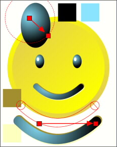 Apply a circular fill to the ellipse eyeballs using black and pale blue. Drag the center of the fill up and left. Add a smaller white ellipse for a highlight. Copy the eyeball shape (Ctrl C) and then select the mouth and Paste Attributes (Edit menu). Position the fill center as shown here. Make two duplicates of the smile, one dark yellow and one very pale yellow. Position the dark duplicate up a bit and the pale yellow copy down a bit. Bring the original to the top.