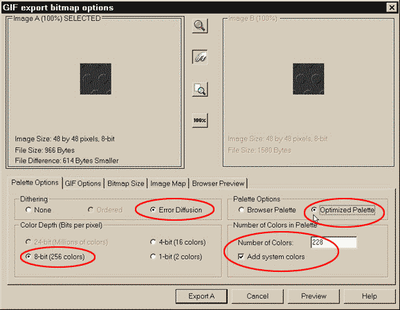 So, what will this tile look like when it appears in my favorite browser you ask. Well, let's see. Marquee select (use the Selector tool to drag a rectangle around) all the tile elements. From the File menu select Export. Select Compuserve Gif for the file format, name the file backgrnd.gif and click OK. When the Gif Export Options dialog opens, (as shown above) click the Palette Options tab, and make the selections shown here outlined in red.
