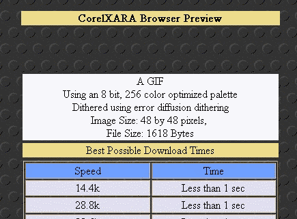 Click on the Browser Preview tab (as shown above). Select Bitmap As Background, and click on Browser Preview. Xara will automatically fire up your Web Browser and display your tiling image. If you select the Include Image Information option, Xara also includes the chart (shown below), providing image type, palette, size, file size and modem download times.