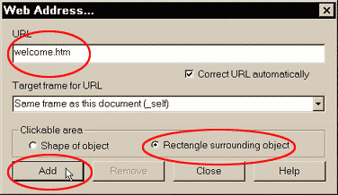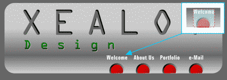 Now we'll assign URLs (Universal Resource Locator -- a fancy term for a web address) to the buttons so our Xealot Design visitors can click an individual button and go to the different sections of our site. This is how the buttons at the top of this page were created. Marquee select (use the Selector Tool to drag a rectangle around) the word Welcome and the first red button. Click the right mouse button, and select Web Address from the pop-up menu. Key in the URL for the Welcome button. For this exercise we'll use welcome.htm. Select the Rectangle Surrounding Object option, and click Add. This creates a hot spot for this object only as illustrated in the inset portion of the illustration at the top of the page. Select the second text and button group and key in the URL aboutus.htm, and once again, click Add . Repeat this for the third group as well. For the fourth group key in mailto:themook@slip.net and click Add and then Close. The last URL will call up a self-addressed e-mail window (the mailto: portion) with my e-mail address, themook@slip.net. You can use any e-mail address with this simple command.