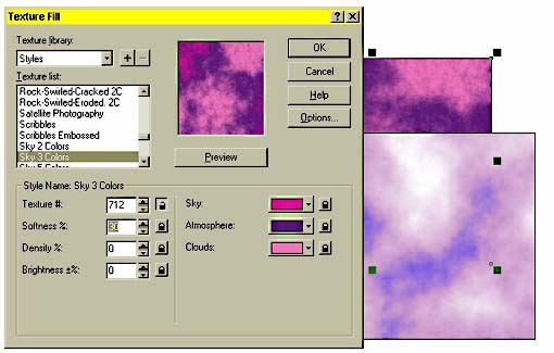 We’ll begin by creating a stormy Southwestern sunset. We can create a reasonably believable cloud-filled sky (free from copyright infringement :-) using Corel's Sky - 3 Colors Texture Fill. To add the appearance of a sunset thunder storm, I've modified the colors (the normal Sky 3 Color fill is shown in the bottom panel) and changed the Smoothness setting to 30 from the default 50. This causes the clouds to be smaller.