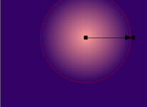 To add drama to our stormy sky we’ll create a light and dark overlay. In a few moments we’ll add a little transparency to it. Create a rectangle the same size as the sky background. Give it a circular fountain fill from pale pink to a deep violet. The circle and arrow represent Xara’s controls for circular fountain fills. Pulling the small outside square expands the fill. You can drag colors from the on-screen palette to either end of the arrow.
