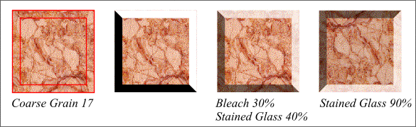 Fill a square that’s the same size as the two L shapes with Marble, Coarse Grain 17. Fill the top L shape white and the bottom L shape black. Apply a Bleach transparency 30% to the white L shape and Stained Glass 40% to the black. If you rotate the button 180° it appears to be recessed. Placing a smaller black square over the center and applying a Stained Glass transparency 90% makes it appear to recede more. That’s all there is to it!