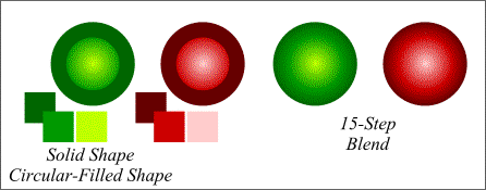 Taking this a step farther, create two circles. Fill the larger circle solid deep green. Fill the smaller circle with a Circular Fill using medium green and chartreuse. Apply a 15-step Blend. Do the same with red.