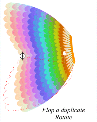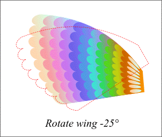 Select the new wing. On the Property Bar key in -25 degrees in the Rotation text entry box, and press Enter. Create a duplicate and flop it vertically. Click twice on the duplicate to toggle Rotate Skew mode. Drag the rotation bullseye to the top left corner as shown. Drag the rotation arrow until the duplicate is aligned as shown.