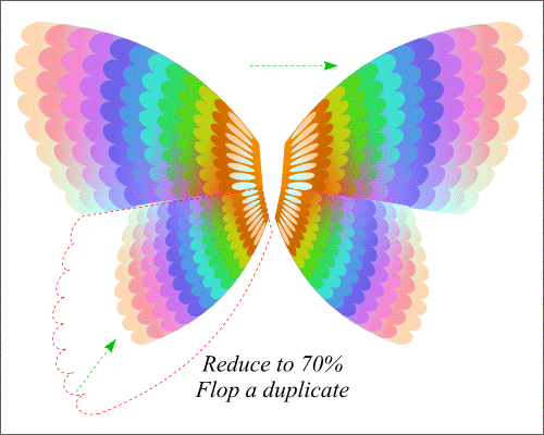 Reduce the duplicate to 70% of the original size. Reposition it as shown. Select both wings and flop a duplicate. Wings!